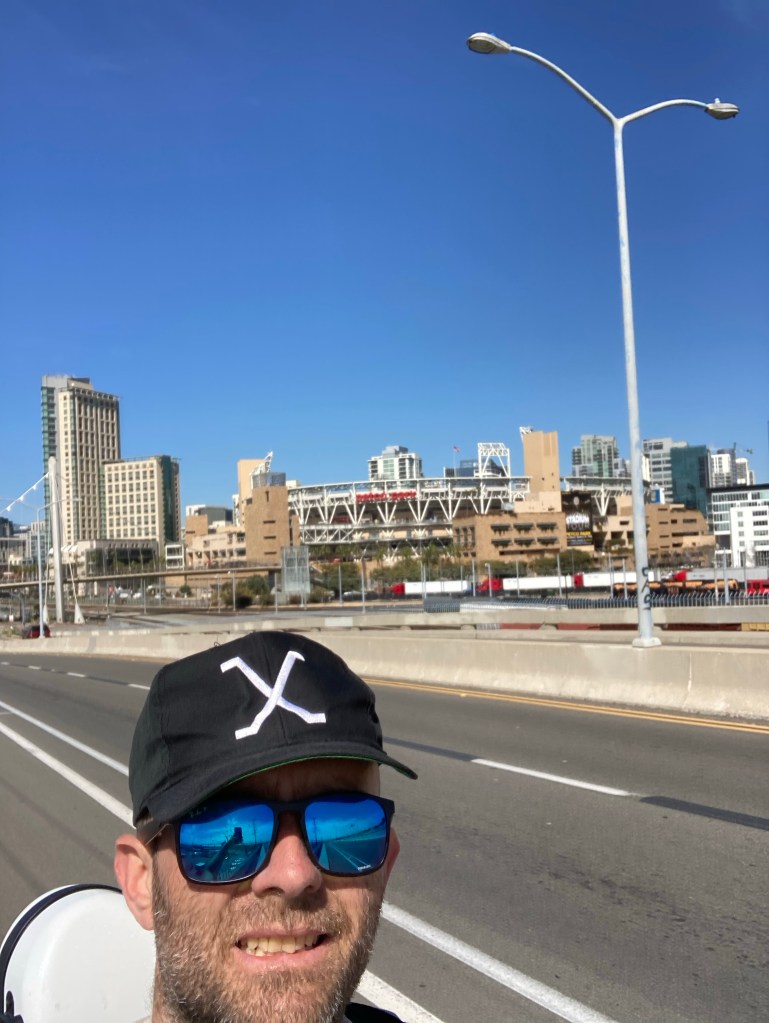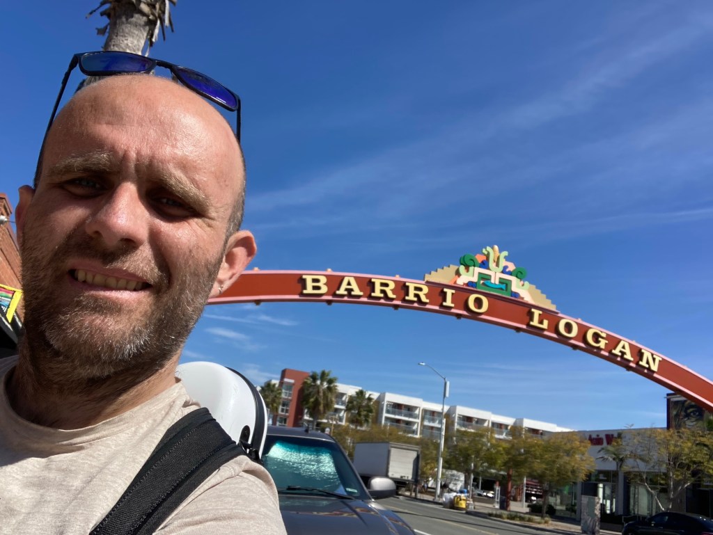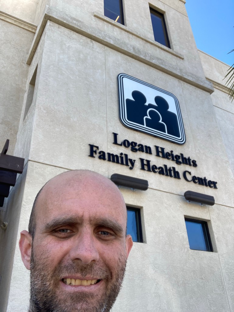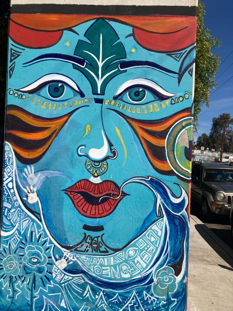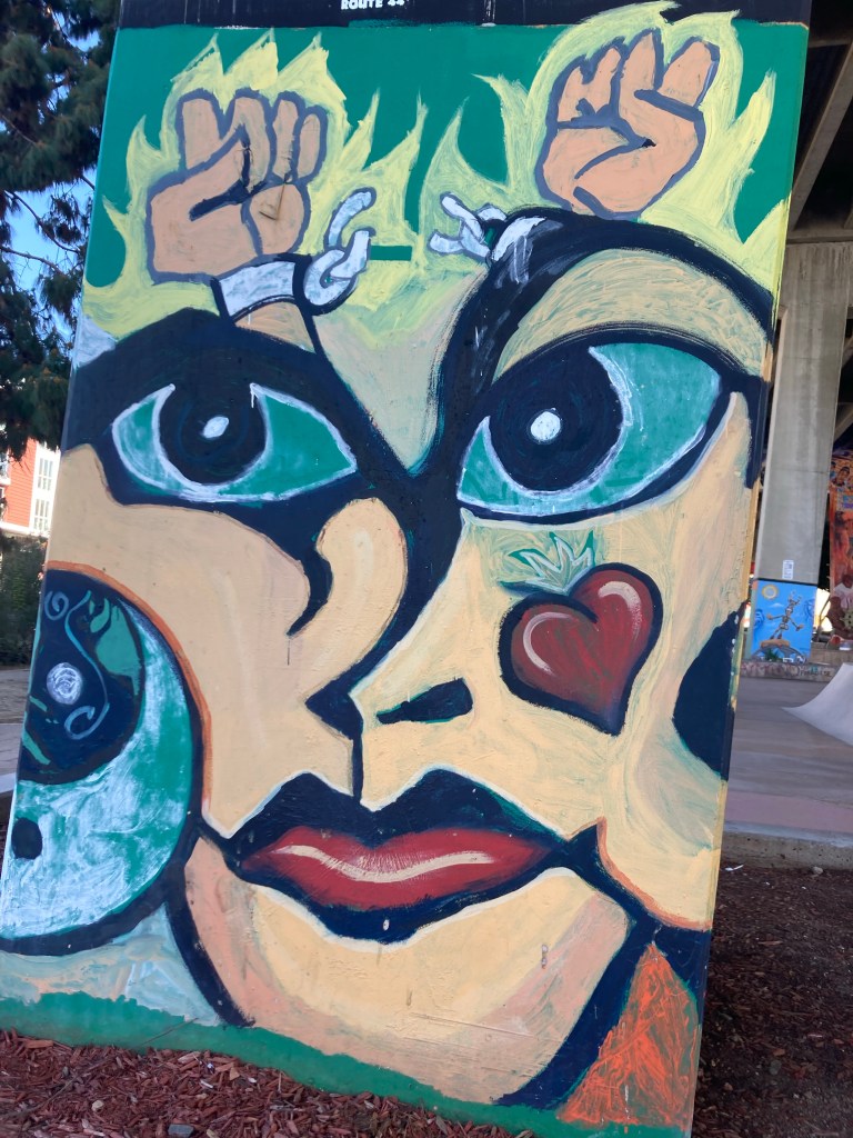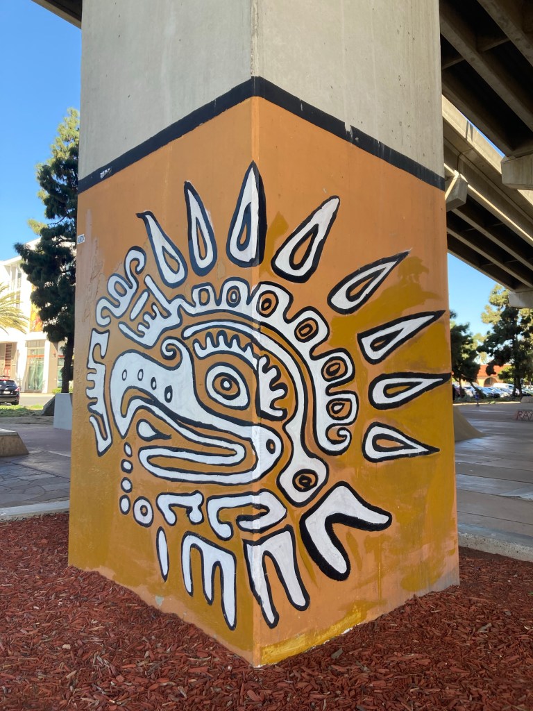 A few miles in, I made a guitarist friend and played a song, “Santa Fe” in front of the USS Midway. Perhaps my new musician amigo was the Great Spirit?Sailboats in the harbor. I imagined living in one, like my attending physician from UCSD, Dr Robin Ryder, did long ago Petco Park, home to the San Diego Padres. Play Ball!Excited to be arriving in Logan Heights, where I had my primary care continuity clinic for three years. Art under the Coronado Bridge. An eagle?This could be a totem pole, a tribute to the Great Spirit. Art under the Coronado Bridge. Break our mental chainsOutside the health center where I had my clinic from 2008-2011. UCSD no longer has a relationship with Logan Heights Family Heath Center. After 10 miles of walking I needed some refreshments. Back on the road. I know this isn’t the Great Spirit. It looks like a Diablo. Lost pup:(