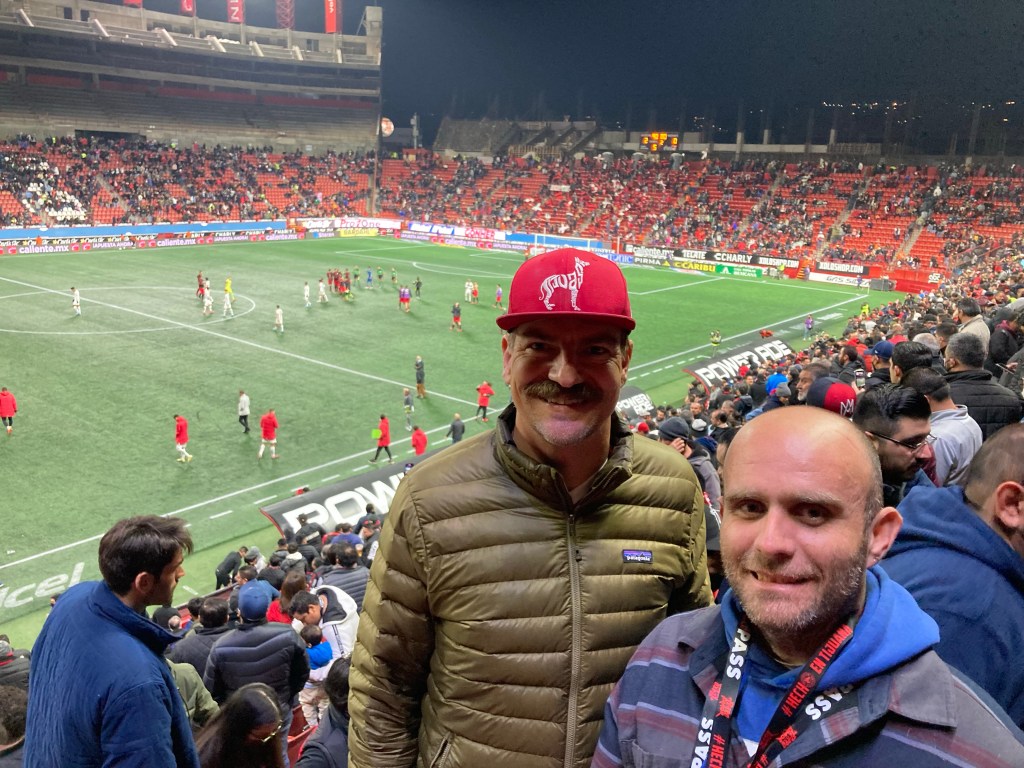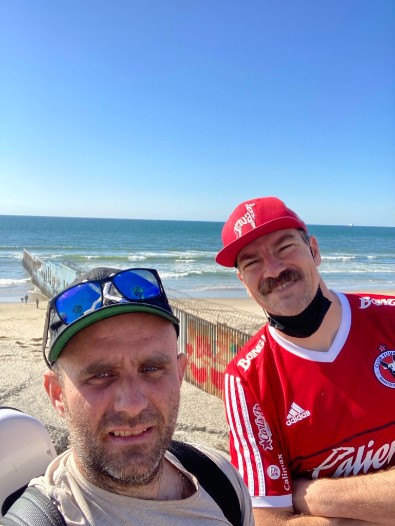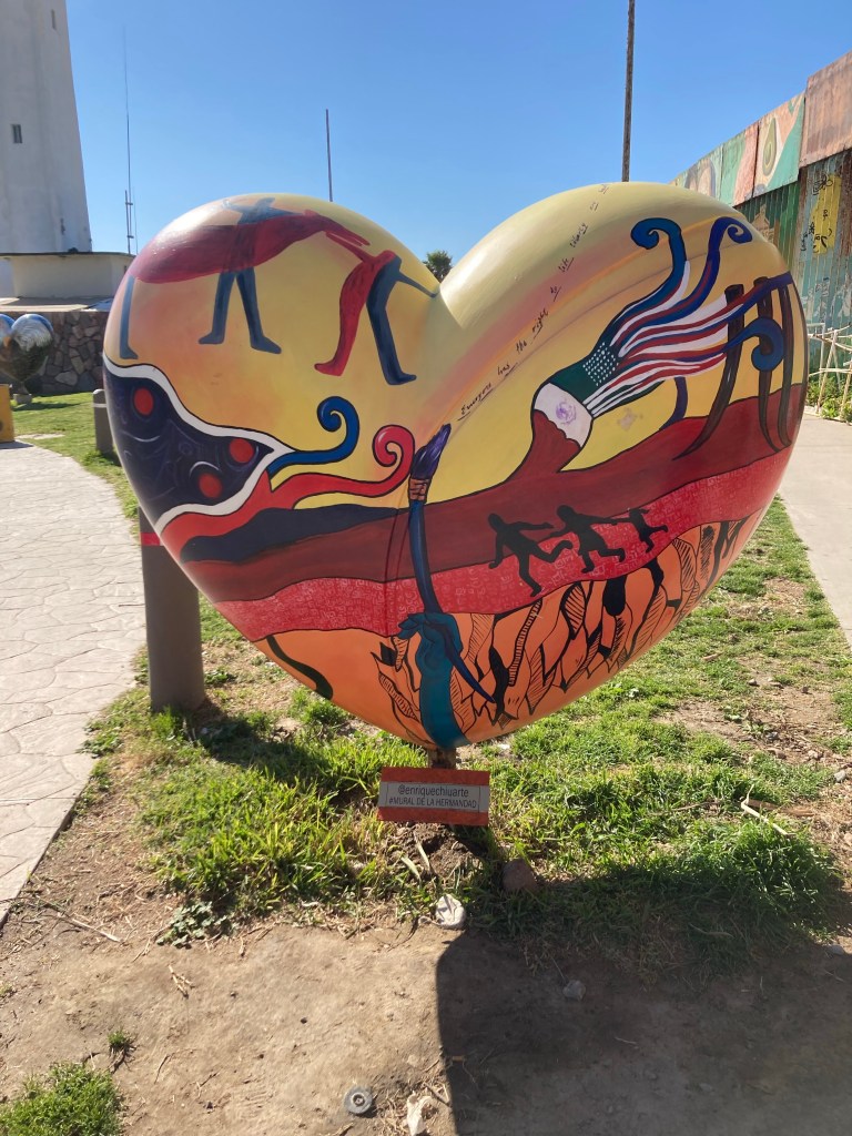Perhaps s/he was looking for the Great Spirit. Ben Hulley picked me up before I accidentally wandered onto the US Naval Base. Then we drove down to Playas De Tijuana. Our plan – a Xolos soccer game at 7 pm. But first, we stopped by Playas looking at a garden near the border fence. Heart sculpture in Playas. The border. Dr. Ben Hulley and I, standing where the border fence stretches out into the Pacific OceanCorazon roto? Broken heart?Go Xolos!Back in California after the soccer game (Tijuana won, 2-0). I do think I found the Great Spirit in the stadium, among the singing, flag waving, dancing Xolos fans.